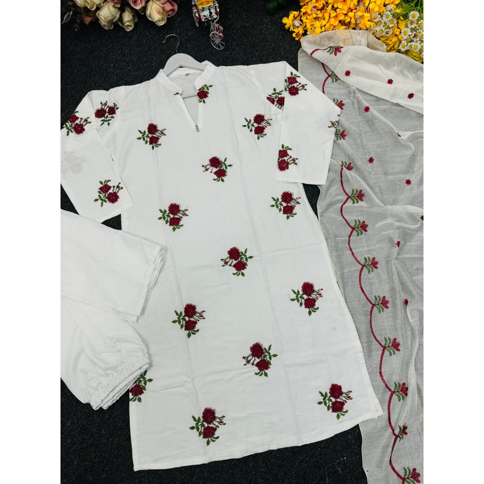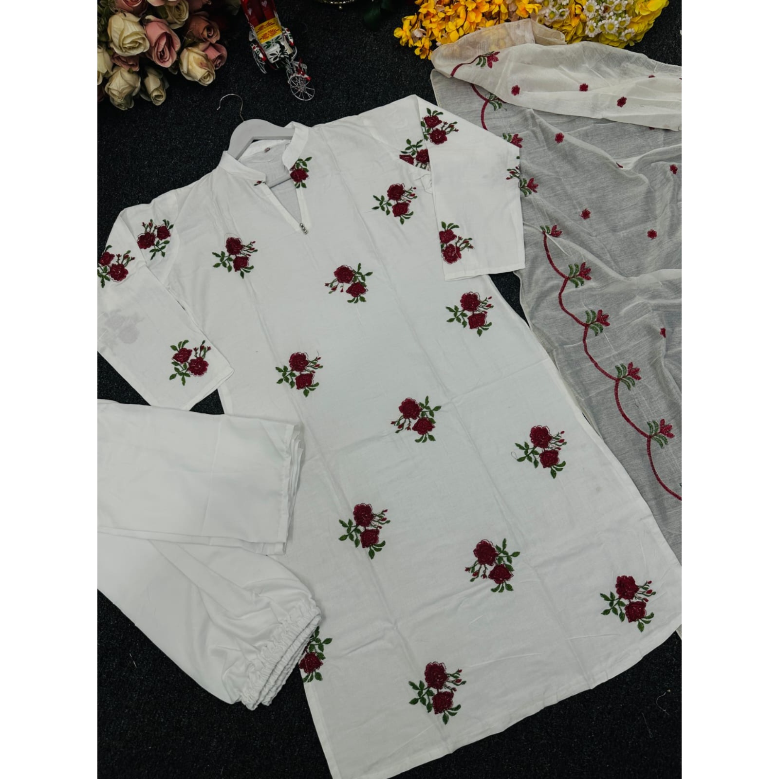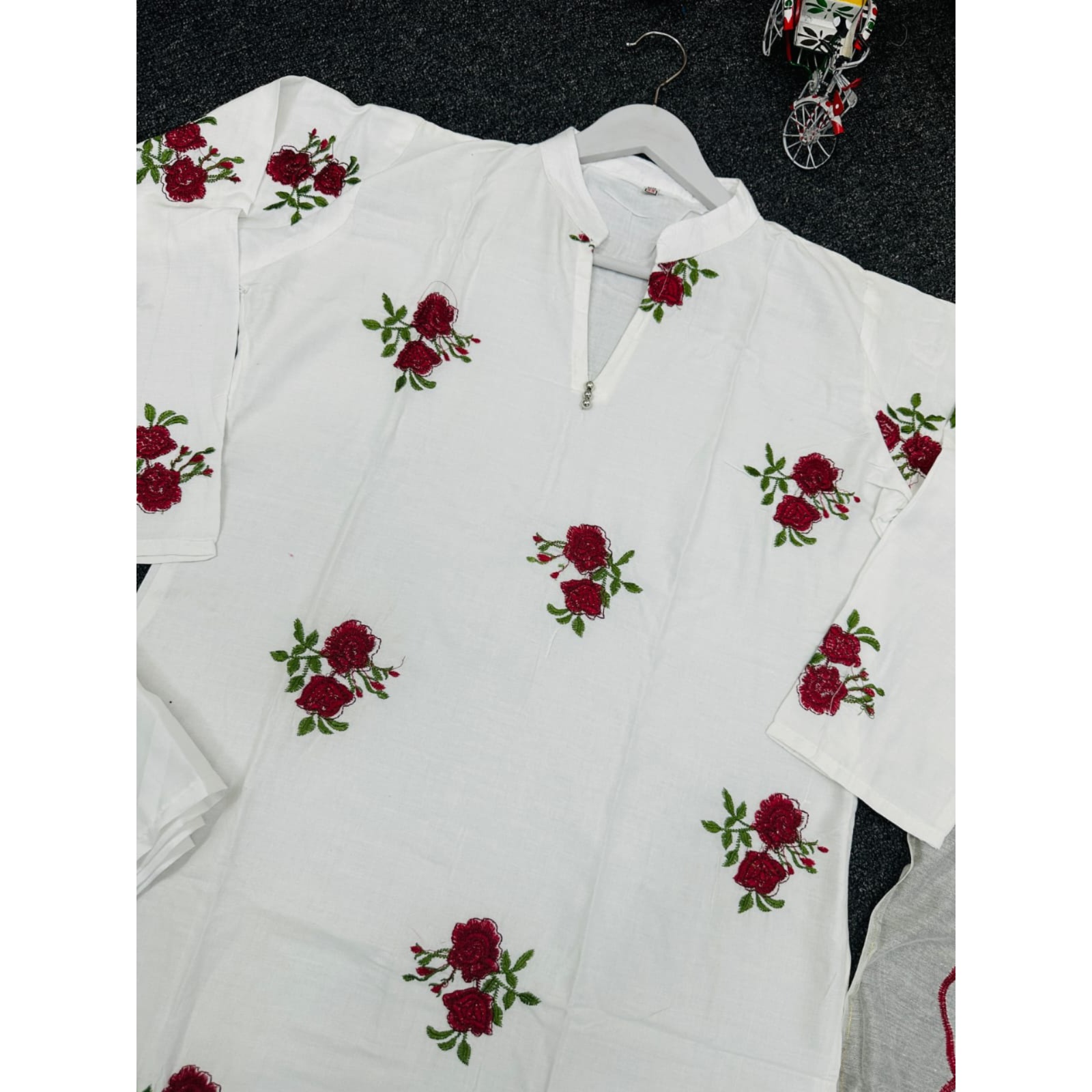 সাদা পরী,লাল গোলাপ এমব্রয়ডারি কাজ করা সম্পূর্ণ সেলাই করা থ্রি-পিস ।